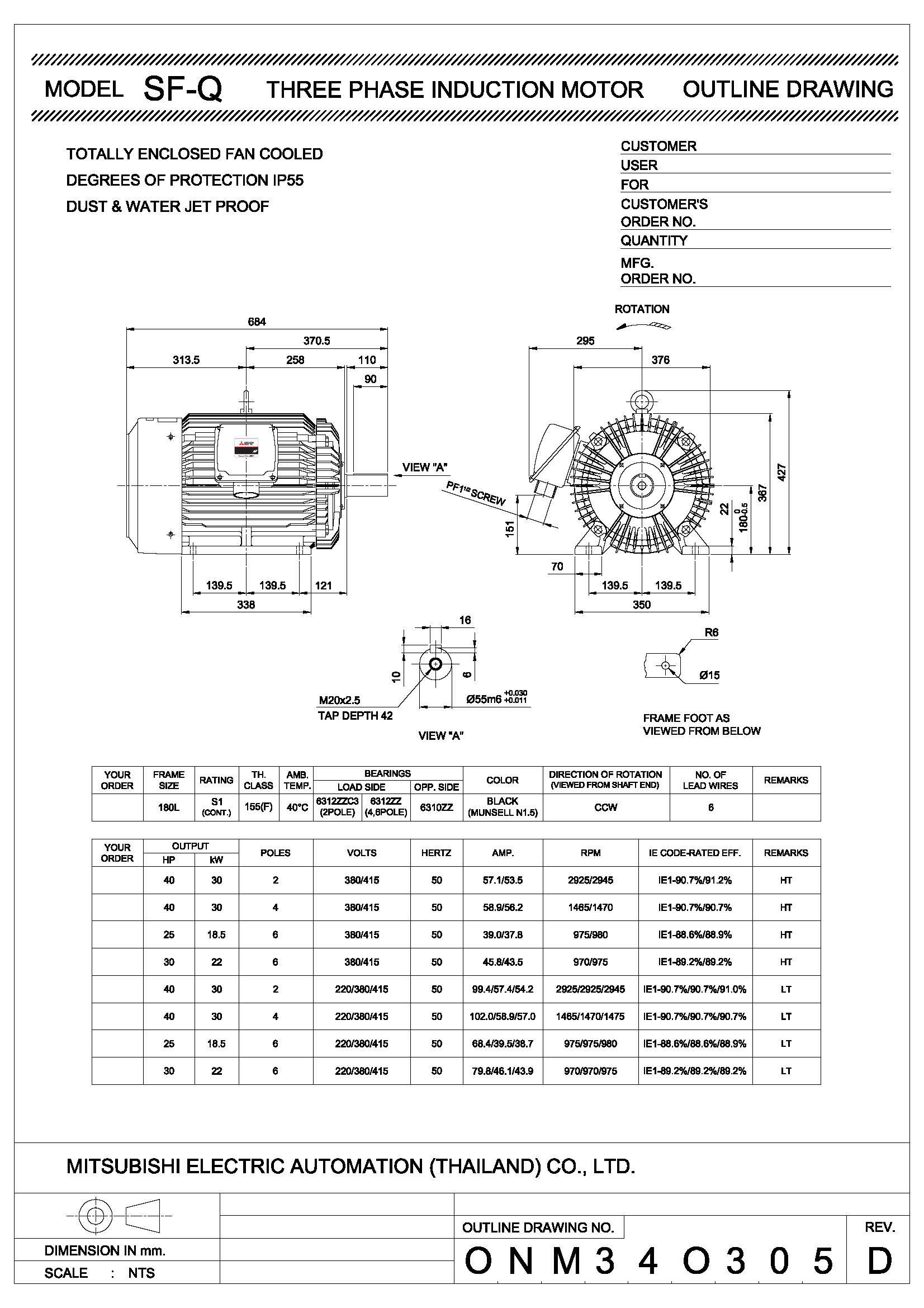 มอเตอร์มิตซูบิชิ MITSUBISHI 40 แรงม้า รุ่น SF-Q ชนิดหุ้มมิด ไฟฟ้า 3 เฟส 380/415V IP55