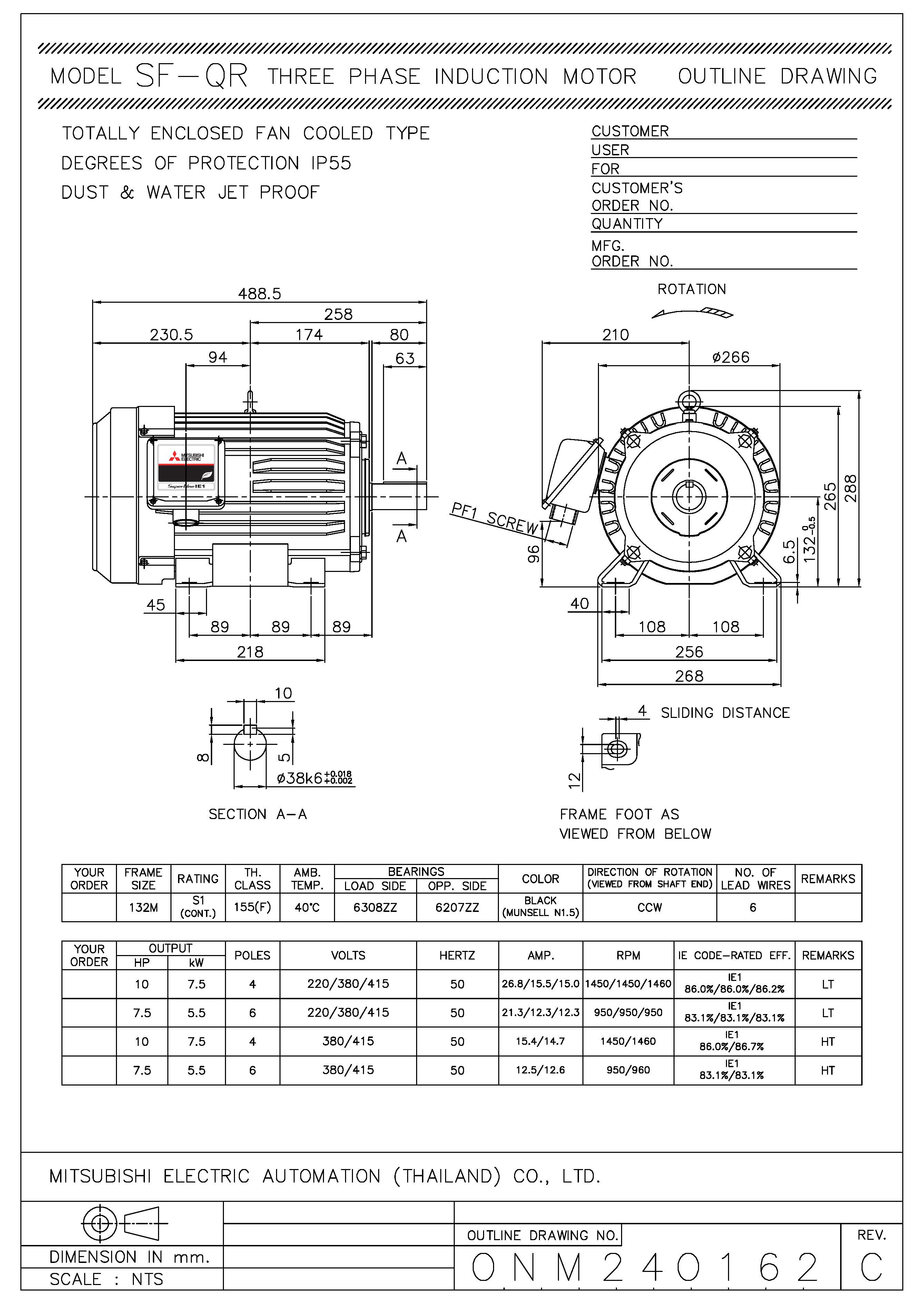 มอเตอร์มิตซูบิชิ MITSUBISHI 10 แรงม้า รุ่น SF-QR ชนิดหุ้มมิด ไฟฟ้า 3 เฟส 380/415V IP55