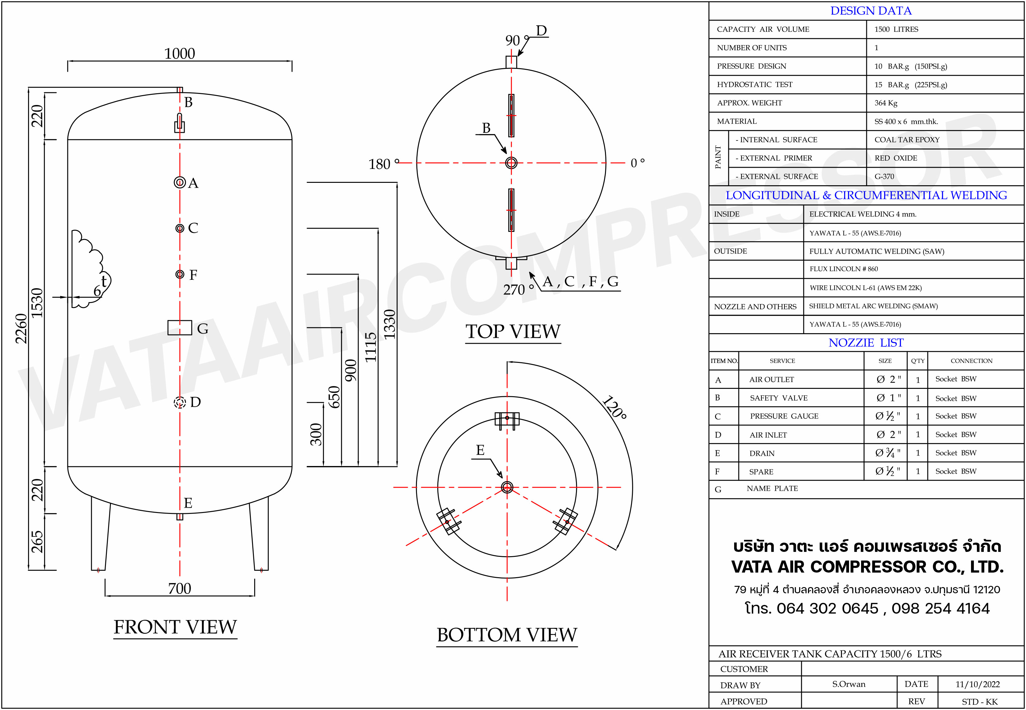 (ออกแบบแรงดันเอาต์พุต 10 บาร์) ถังรับทำจาก SS400 พื้นผิวด้านในเคลือบด้วยอีพ๊อกซี่และสีรองพื้นออกไซด์แดง