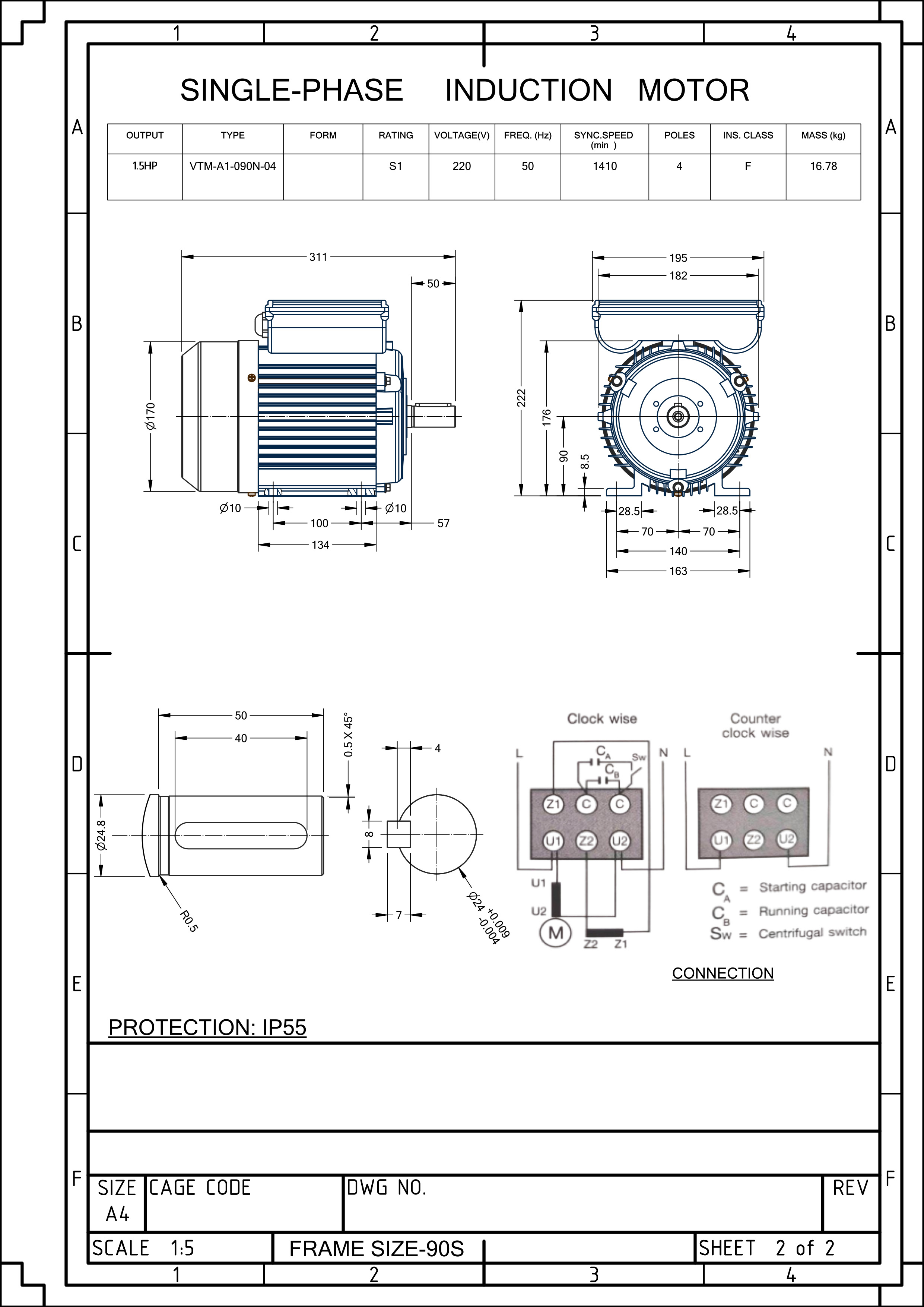 มอเตอร์วาตะ VATA 1.5 แรงม้า รุ่น VT 1.5HP 4P ไฟฟ้า 220V IP55